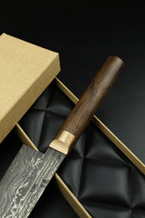 Klinge: Handgeschmiedeter Damast, 63 HRC, 180 mm