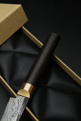 Die Klinge besteht aus hochqualitativem, mehrfach gefaltetem Damaststahl, der für seine außergewöhnliche Härte und Langlebigkeit bekannt ist. Wir erreichen somit ein Vielfaches der Schnitthaltigkeit von herkömmlichen Kochmessern.