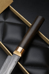 Die Klinge besteht aus hochqualitativem, mehrfach gefaltetem Damaststahl, der für seine außergewöhnliche Härte und Langlebigkeit bekannt ist. Wir erreichen somit ein Vielfaches der Schnitthaltigkeit von herkömmlichen Kochmessern.