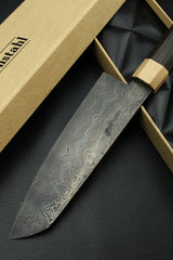 Klinge: Handgeschmiedeter Damast, 63 HRC, 180 mm
