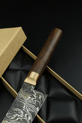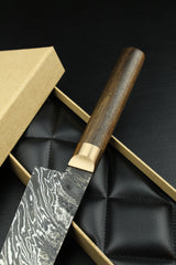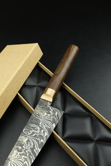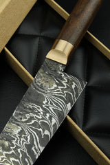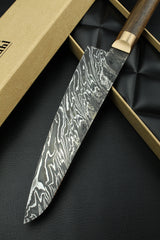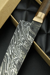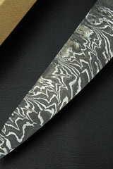Klinge: Handgeschmiedeter Damast, 63 HRC, 215 mm