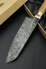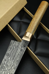Klinge: Handgeschmiedeter Damast, 63 HRC, 180 mm