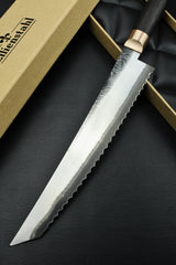 Das Brotmesser von Lilienstahl vereint die zeitlose Eleganz tausendjähriger Mooreiche mit der raffinierten Ästhetik einer San-Mai-3LN-Klinge. Die quer satinierte Zinnbronze-Zwinge fügt sich als kunstvolles Bindeglied in ein harmonisches Gesamtbild ein.