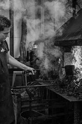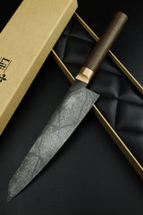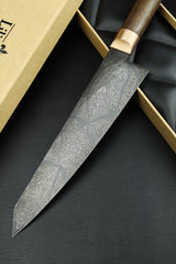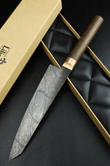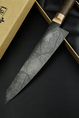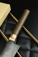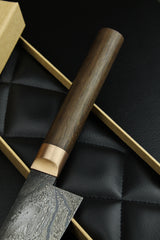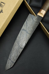 Blau, Schwarz, Silber oder Grau - die Schattierungen unserer vier Hauptstähle spiegeln sich im Damast in Form von Sternen wider. Der Griff besteht aus einem Stück Eiche, dessen Veredelungsprozess im Jahr 800 v. Chr. in einem europäischen Flussbett begann.