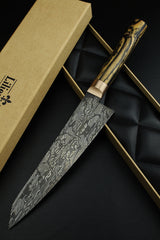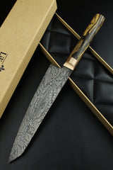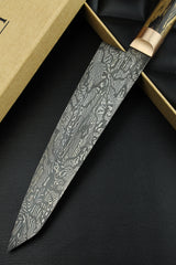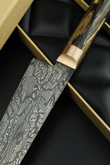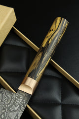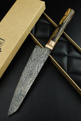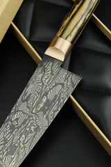 Blau, Schwarz, Silber oder Grau - die Schattierungen unserer vier Hauptstähle spiegeln sich im Damast in Form von Sternen und komplexen Mustern wider. Die meisten Menschen kennen den Vergleich 'Schwarz wie Ebenholz', es gibt jedoch eine noch exklusivere Verwandtschaft, nämlich schwarz-weißes Ebenholz, dessen genauere Bezeichnung B&W Royal Ebony ist. Wir haben ein kleines Kontingent erworben, das seit ca. 50 Jahren getrocknet wurde, und es wirkt so, als hätte dieses besondere Holz nur auf unseren Damaststahl in Form T gewartet. .