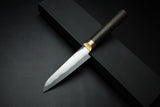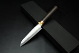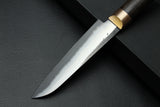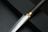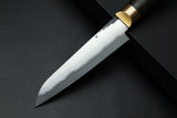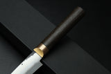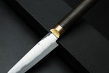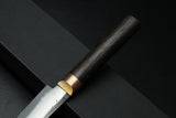 Glänzend durchziehen die Markstrahlen der tausende Jahre alten Mooreiche den Griff des Pettys. Nur der Geruch verrät die natürliche und ökologisch vertretbare Stabilisierung mit Lärchen und Fichtenharz gegen Feuchtigkeit und Gerüche. Die quer satinierte Zinnbronze bildet das Kernstück zwischen der San Mai 3LN Klinge und dem East Style Oval Griff ausgeführt als echte Zwinge. Die Diffusionszone zwischen dem Mantelmaterial und der Schneidlage der Klinge erlauben einen Einblick in das traditionelle Schmiedeverfahren.