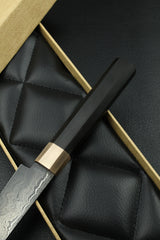 Die Klinge besteht aus hochqualitativem, mehrfach gefaltetem Damaststahl, der für seine außergewöhnliche Härte und Langlebigkeit bekannt ist. Wir erreichen somit ein Vielfaches der Schnitthaltigkeit von herkömmlichen Kochmessern.