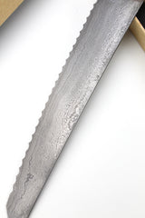 Wir sind stolz, unser Brotschwert aus hochlagigem Torsionsdamaststahl vorzustellen. Unserer Interpretation nach ähnelt die Struktur zeitlosen Gesteinsformationen, die durch Sedimente und elementare Kräfte wie Hitze und Druck geformt wurden. Zwei dieser Kräfte sind tatsächlich für die marmorartige Damaststruktur verantwortlich. Im Schmiedeprozess werden 4 verschiedene Stähle bei über 1250 Grad Celsius erneut zu einem Stück Damast verbunden. Das Wissen und die Fertigkeiten des Schmieds formen das endgültige Muster in vielen Stunden Handarbeit.Technische Daten: