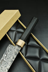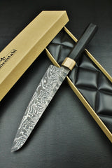 Klinge: Handgeschmiedeter Damast, 63 HRC, 215 mm