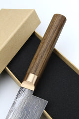 Klinge: Handgeschmiedeter Damast, 63 HRC, 215 mm
