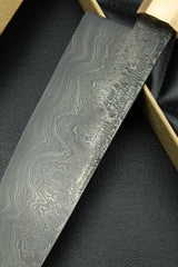 Klinge: Handgeschmiedeter Damast, 63 HRC, 180 mm