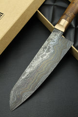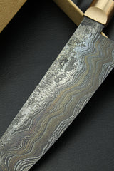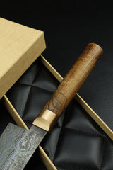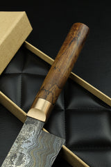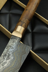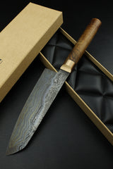 Klinge: Handgeschmiedeter Damast, 63 HRC, 180 mm