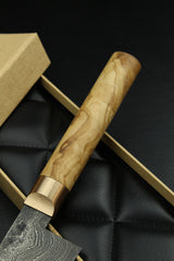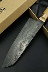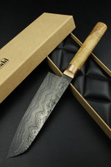 Klinge: Handgeschmiedeter Damast, 63 HRC, 180 mm