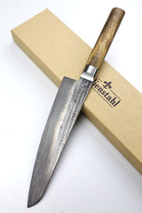 Klinge: Handgeschmiedeter Damast, 63 HRC, 215 mm