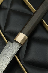 Die Klinge besteht aus hochqualitativem, mehrfach gefaltetem Damaststahl, der für seine außergewöhnliche Härte und Langlebigkeit bekannt ist. Wir erreichen somit ein Vielfaches der Schnitthaltigkeit von herkömmlichen Kochmessern.