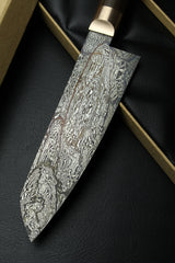 Blau, Schwarz, Silber oder Grau - die Schattierungen unserer vier Hauptstähle spiegeln sich im Damast in Form von Sternen und komplexen Mustern wider. Der Griff besteht aus einem Stück Mooreiche, dessen Veredelungsprozess im Jahr 800 v. Chr. in einem europäischen Flussbett begann durch Sauerstoffabschluss und tausnde Jahre.