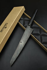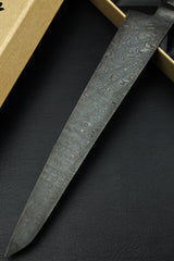 Die extrem dünn ausgeschliffene Klinge passt sich fein dem zu filetierenden Fleisch- oder Fischstück an. Trotz ihrer 63 HRC Härte weist die komplexe Damastklinge im vorderen Bereich elastische Eigenschaften für hoch präzise Arbeiten auf.