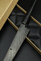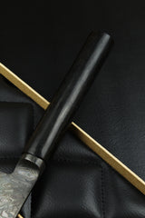 Der Griff wurde aus tief schwarzem Ebenholz gefertigt und vervollständigt die schwarz glänzende Damastklinge.