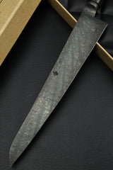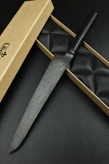 Die japanische Griffform sorgt für den nötigen Halt und die Kontrolle der 245 mm langen patinierten Damaststahlklinge.